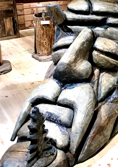 Зачин экспозиции образ горы — герой Калевалы Випунен. имеет своей целью, во-первых, поместить посетителя в определенное пространство, во-вторых, задать систему координат и создать нужный настрой (в том числе, на то, что получение знаний и эмоций на этой экспозиции — это не пассивный, а активный процесс). Здесь символы (камень, дерево, земля, вода, железо, огонь) предстают в буквальном смысле, как характеристики места. Макет раскрывает тему природных и географических ресурсов места. Макет интерактивный — 6 элементов заложены внутрь, и нужно проделать определенные манипуляции, чтобы получить из них знание.
