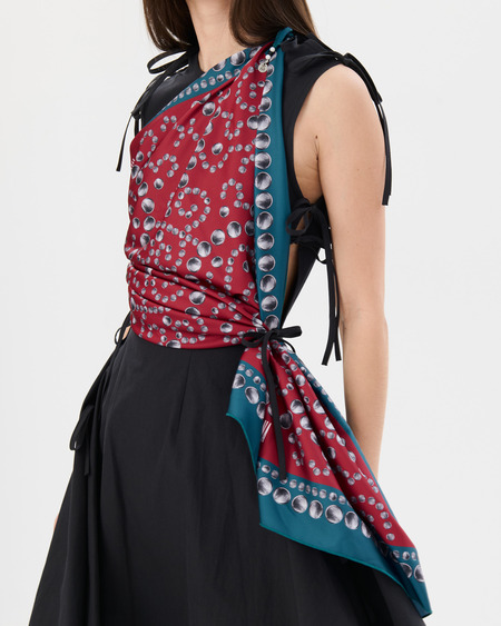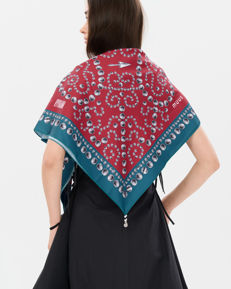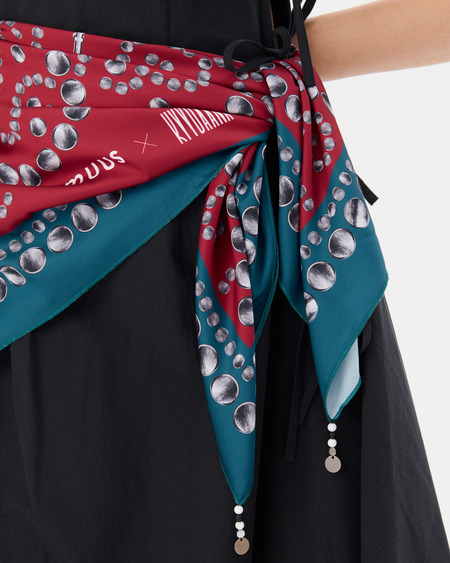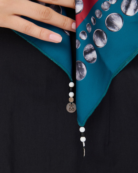 Коллекция включает несколько моделей платков: • Формат: квадратные шелковые платки размером 90×90 см. • Основные мотивы: стилизованные формы коромысла, лунной девы, северных ритуалов и обрядовых украшений (бахрома, ленты, конические бусы).