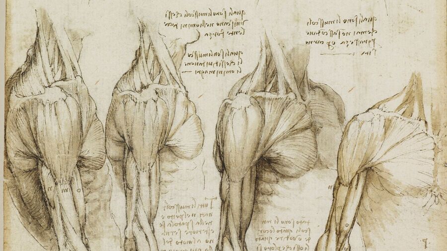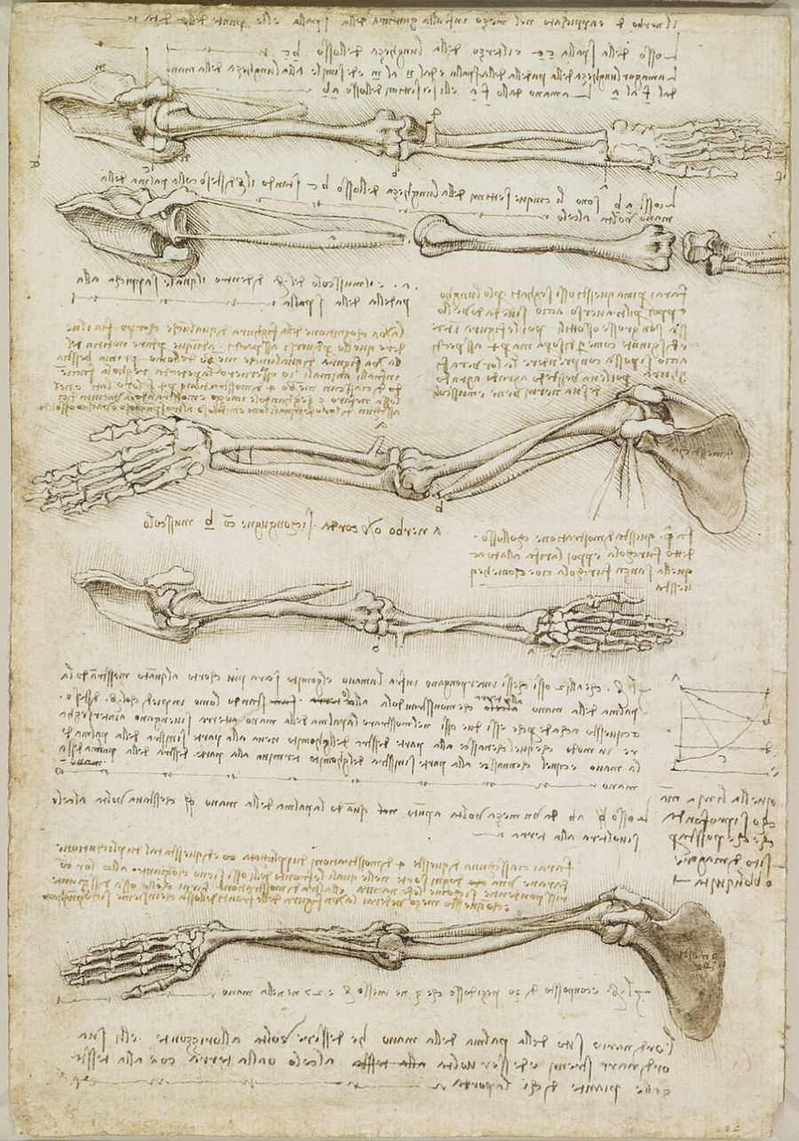 Он делал сотни подробных рисунков мышц, костей, органов и сосудов, сопровождая их собственными пометками и наблюдениями. Проводил вскрытия трупов, чтобы понять точное строение человеческого тела и работу внутренних систем. Особое внимание уделял строению мышц — их форме, креплению к костям, роли в движениях. Например, рисунки мышц рук показывают их напряжение и расслабление, а зарисовки скелета и суставов помогали понять, как именно соединены кости и как они влияют на движение.