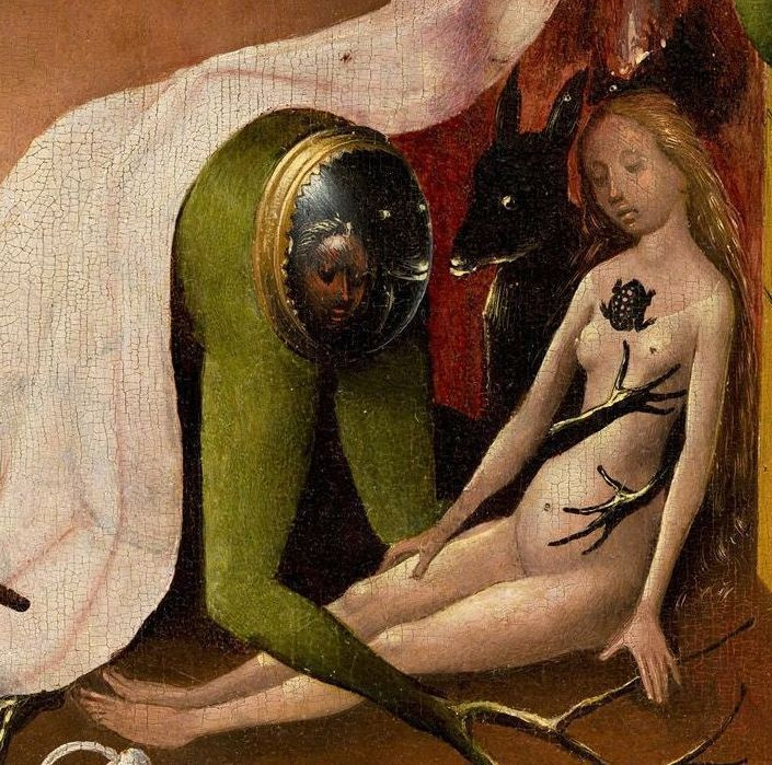 Женщина с зеркалом изображена и на знаменитом полотне Иеронима Босха «Сад наслаждений. „Среди высохших, мертвых деревьев, на фоне безжизненного, „стерильного“ пейзажа, т. е. на фоне своеобразного „отрицательного двойника“ райского сада, сидит на земле женщина и смотрится в зеркало, кое-как установленное на заду одного демона, а в это время другой злой дух хватает сзади саму женщину. <…> Занятая самолюбованием гордячка не способна дать жизнь; бесплодное, как женщина, зеркало, ничего не создающее, а только повторяющее чужие формы, занимает свое место среди многих изобретений человека, среди коих немало бесполезных и опасных.» [1]