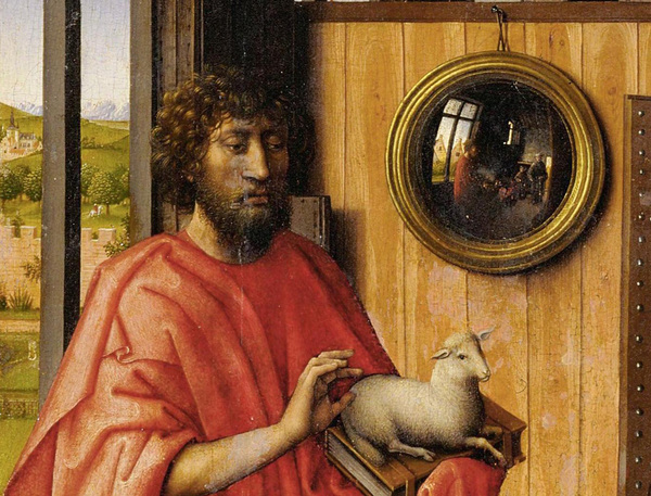 Тициан. «Женщина перед зеркалом» ок. 1515 г. // Робер Кампен. «Алтарь Верля (триптих). Левая часть. Иоанн Креститель и Генрих фон Верль» 1438 г. Фрагмент