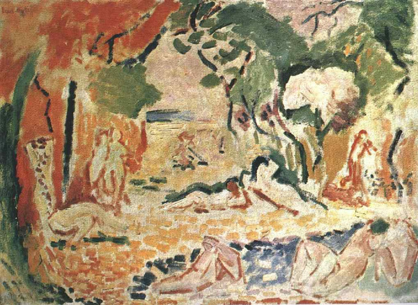 На следующем этапе фовисты (Матисс, Дерен, Вламинк) освободили цвет от рабства реализма, превратив его в независимый инструмент эмоции и энергии. Они отказались от натуралистических оттенков, заменив их чистыми, ядовито-яркими тонами, которые не описывали реальность, а выражали внутреннее состояние. Например, в «Радости жизни» Матисса (1906) деревья оранжевые, небо розовое, тела с зеленцой. Цвет здесь — не атрибут предмета, а проводник эмоции. В чем смысл этого жеста? Фовисты доказали, что цвет может существовать ради себя самого, а не ради имитации видимого мира. Можно — вообще оставить только цвет! Это сделают Малевич, Ротко, Кляйн…