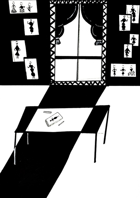 Центральным мотивом является комната с рабочим столом и альбомом с эскизами, а стены украшены силуэтами моделей в геометричных нарядах. Композиция создает ощущение глубины и акцентирует внимание на творческом процессе. Модернизм в моде здесь проявляется через минимализм и отказ от избыточных деталей: силуэты моделей лаконичны и функциональны, подчеркивая архитектурность пространства.