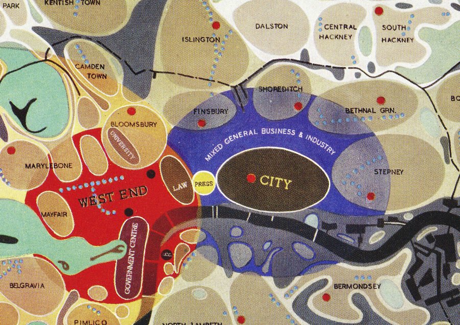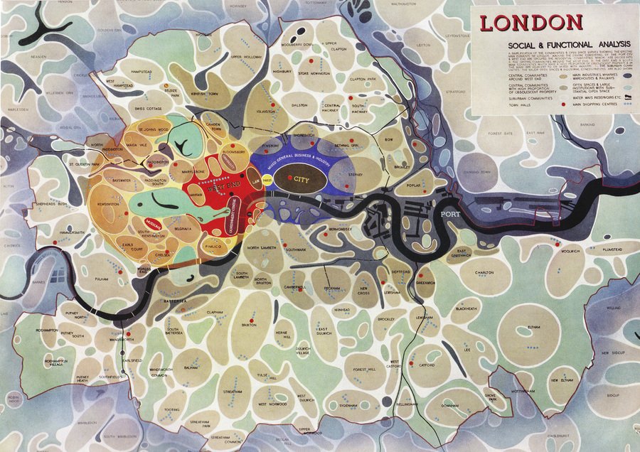 карта социального и функционального анализа Лондона, Патрик Аберкромби, в карте даны очертания примерных зон вместо конкретных границ территории
