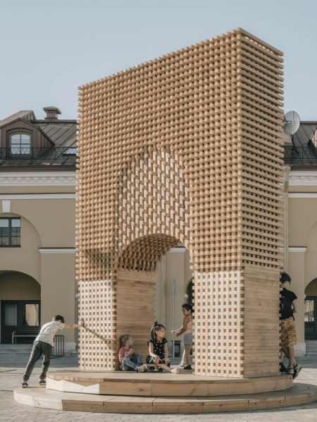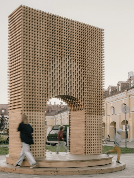 Вращающаяся Триумфальная арка (2020) бюро KATARSIS ab в Санкт-Петербурге представляет собой постмодернистскую деконструкцию, где динамичное исполнение остроумно отрицает идею монументальной стабильности.
