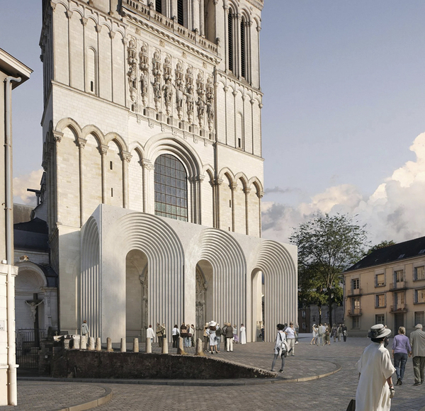 Современный вход в собор Святого Маврикия (2021) Kengo Kuma and Associates во Франции предлагает минималистичную интерпретацию, где каменные архивольты создают медитативное переходное пространство, деликатно вступая в диалог с готическим наследием.