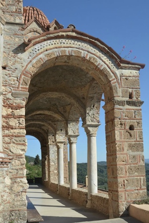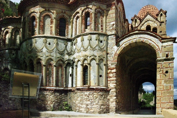 Один из интересных примеров сохранения и переосмысления римской триумфальной схемы возникает в поздневизантийском комплексе — Монастыре Пантанасса в Мистре (1428). Здесь мотив монументальной арочной галереи, обрамляющей фасад, наследует римскую масштабность и конструктивную ясность. Однако он полностью интегрирован в структуру православного храма, становясь не символом военного триумфа, а архитектурным обрамлением для священного пространства, «вратами» в духовный мир. Этот объект демонстрирует, как имперский римский прототип был ассимилирован иконографией и функцией христианской архитектуры. Столетия спустя объект станет образцом для неовизантийских реплик.