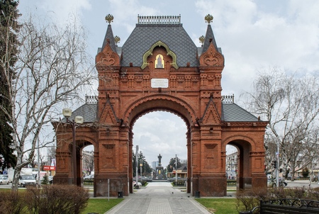 Александровская триумфальная арка в Краснодаре (1888) В. А. Филиппова представляет яркий пример неорусского стиля, где классическая форма наполняется килевидными кокошниками и шатровыми завершениями, становясь символом национальной идентичности.