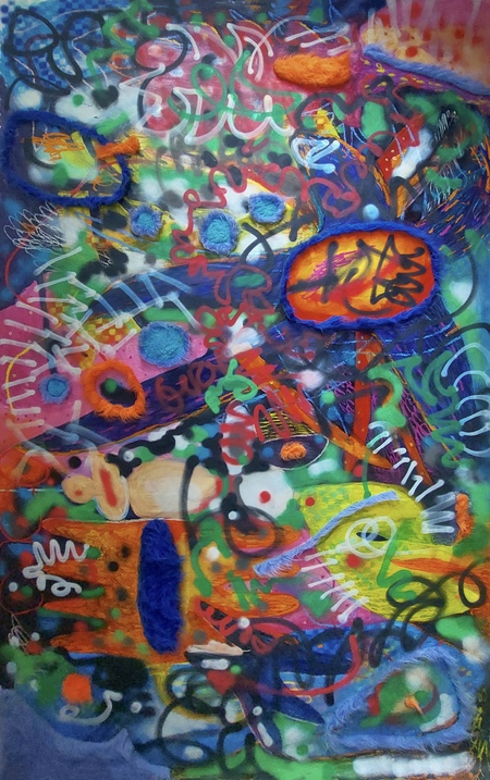 Этот проект начинался как визуальное исследование света, игры и «детскости» — вдохновлённый творчеством художников группы The Fools. Мне хотелось создать яркое, жизнерадостное пространство, своего рода игровое поле. Однако в процессе работы проект радикально трансформировался — и стал автопортретом человека, живущего с депрессией и СДВГ. Центральный объект — большой баннер, над которым я работала в течение года. По мере моего личного процесса (диагностика СДВГ, начало терапии от депрессии) работа постепенно менялась: от логичной структуры с читаемыми абстрактными растительными формами и открытыми цветами — к всё более хаотичной, многослойной и визуально «перегруженной» композиции и грязной палитре. Как зритель, ты буквально ощущаешь, что глаз не знает, за что зацепиться. Работа как будто «кричит» на тебя. Но она также отлично показывает мир изнутри, когда ты живёшь с постоянным беспорядком мыслей, сильными перепадами состояний, эмоциональным хаосом, ощущением, что тебя слишком много. Так же была сделана «черновая» фристайл работа, где я пробовала новую для себя технику. И хотя она не стала итоговым вариантом, в ней так же прослеживается изначальная задумка и большое различие по сравнению с итоговым вариантом. Проект интересен не столько визуально, сколько личностно. Он становится визуальным телом переживания, в котором зритель попадает в поле «слишком»: слишком ярко, слишком громко, слишком много. Это и есть мой личный «разрушенный сарай» — пространство, где каждая линия, пятно или цвет говорят о внутреннем распаде, но и о сложности, многосоставности и способности меняться. Этот проект — попытка визуально зафиксировать состояние, которое обычно не видно. Это попытка не просто говорить о ментальном здоровье, а дать зрителю непосредственный телесный и эмоциональный опыт, сопоставимый с тем, как воспринимается реальность человеком в состоянии депрессии и нейроотличия. Это не просто личная история. Это художественный жест о множественности субъекта — изменчивого, хрупкого, нелинейного. .