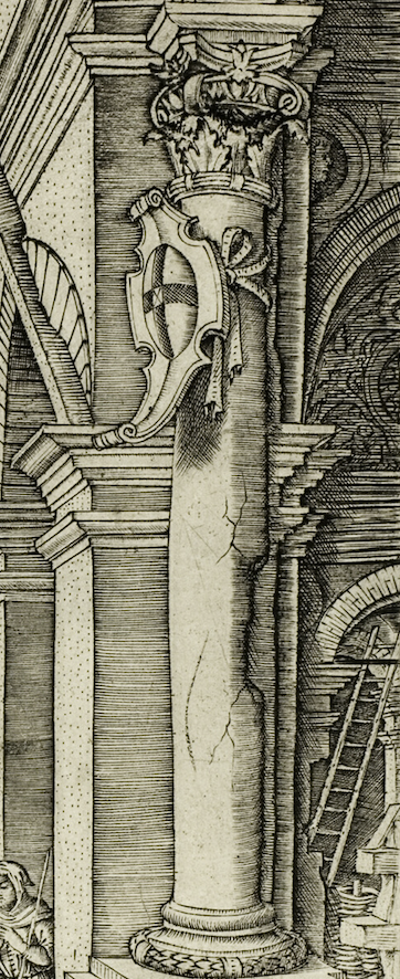 На картине «Святой Себастьян» Антонелло да Мессина, помимо фрагмента колонны, которая не приняла на себя пластику разрушения — без трещин, без сколов, лишь с ровным срезом, — мы можем уподобить столь же прочной руине и образ Святого Себастьяна. Его тело предстает как «архитектура плоти», утратившая целостность, но застывшая в момент разлома. Мессина будто приостанавливает время, превращая сцену мученичества не в мгновение физической боли, а в символ вечности и духовного преображения — событие, существующее вне хода времени.