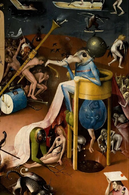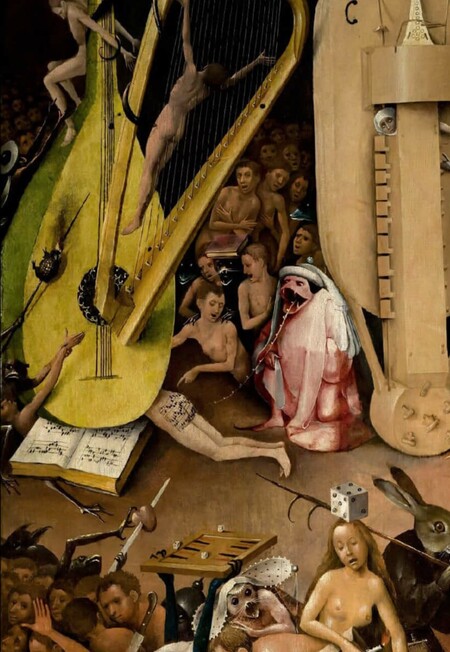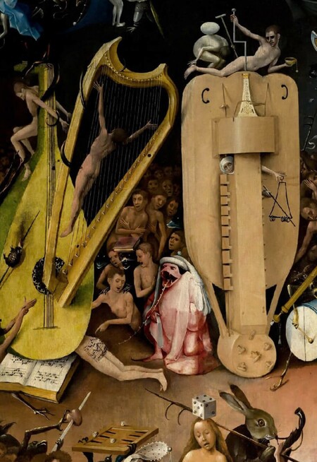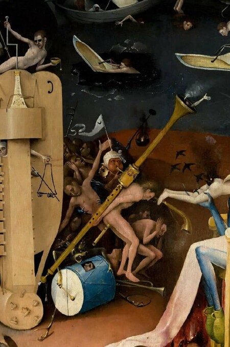 Правая створка «Ад» у Босха — это мир, где орудия наслаждения превращаются в орудия пыток. Золотая лютня, прибитая к ягодицам одного из грешников, трактуется как символ разврата и дисгармонии [3]. Гигантская волынка ассоциировалась с непристойностью и телесными низменными желаниями, теперь стала орудием пытки. Это наглядный пример того, как Босх через фантасмагорию раскрывает подтекст: грех несет в себе собственное наказание.