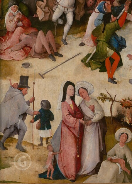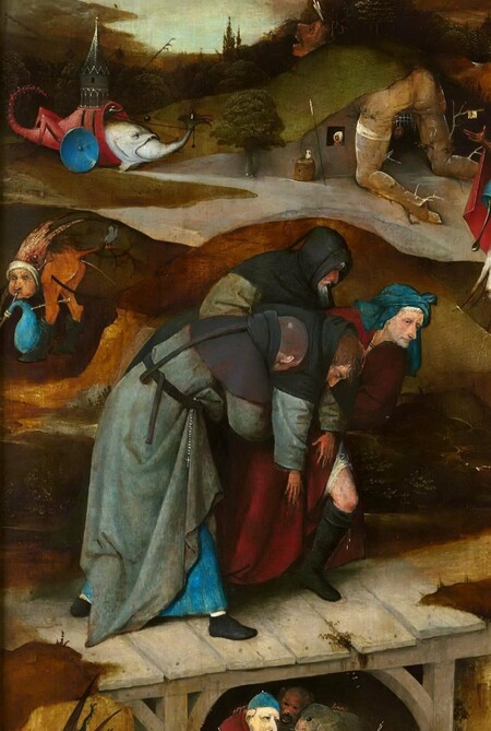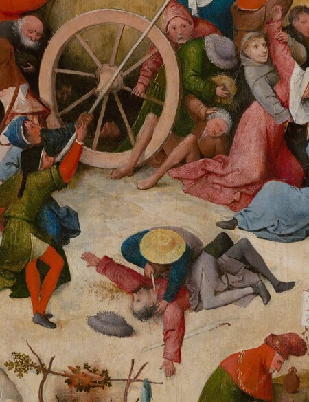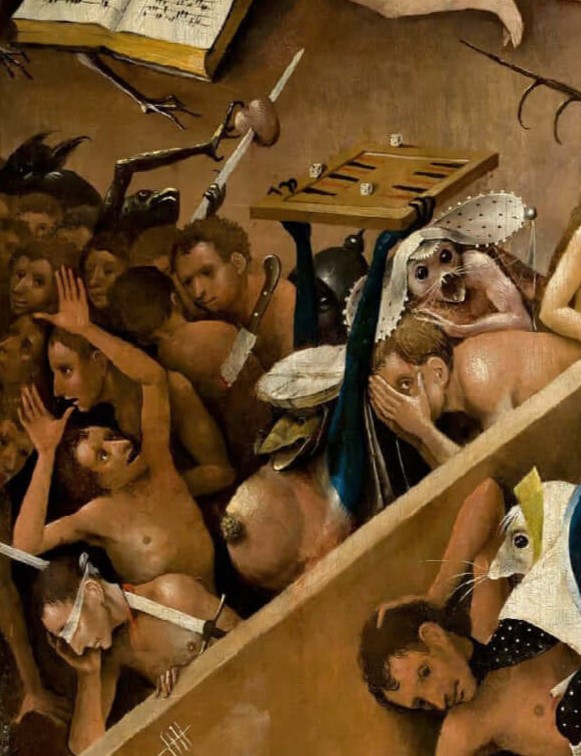 Центральная часть: Огромный воз сена, за которым идут папа, император, крестьяне — все сословия, охваченные безумием. Это прямая иллюстрация нидерландской пословицы «Мир — это воз сена, и каждый старается урвать с него сколько может». Фантасмагория здесь в абсурдности зрелища: люди убивают друг друга из-за охапки сена, не замечая, что воз тащат в Ад демоны. Подтекст — уничижительная критика всех социальных слоев и тщетности мирских благ.