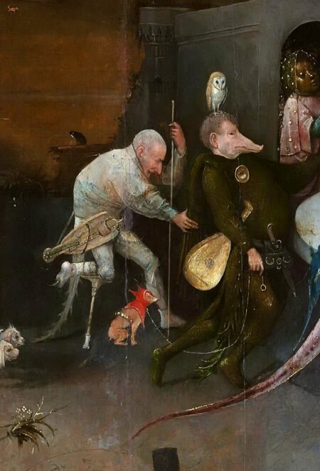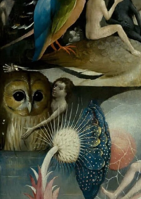 Символика бестиариев и алхимии: Животные у Босха почти никогда не нейтральны. Сова, часто встречающаяся в его работах, в средневековой традиции символизировала не мудрость, а грех, ересь и духовную слепоту, так как боится света. Жаба, согласно бестиариям и алхимическим трактатам, была символом дьявола и «первичной материи», подлежащей трансмутации [7]. Алхимические символы (печи, процессы дистилляции) интерпретируются исследователями, например как Д. Баксом, как метафоры духовного преображения или, наоборот, греховного разложения [1].