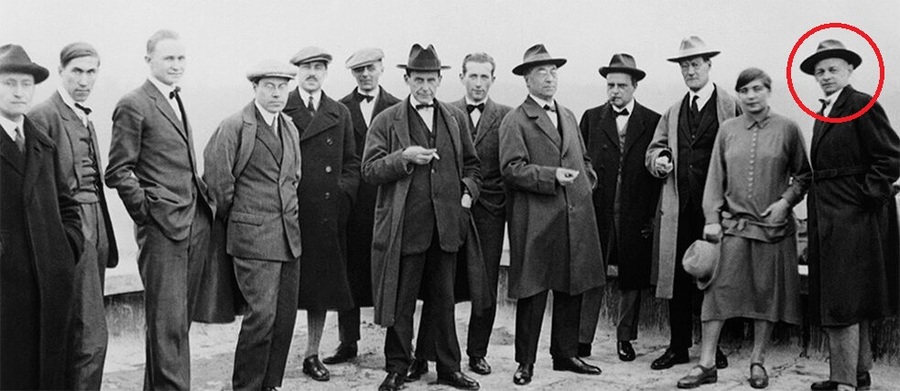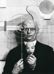 Слева — Мастера на крыше здания Баухауза, (1926), Справа — Оскар Шлеммер «Автопортрет с маской», (1923)