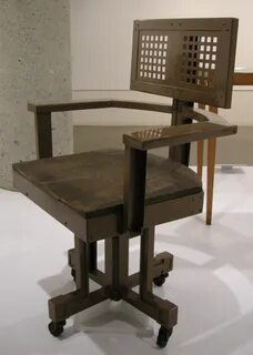 Офисный стул Фрэнка Ллойда Райта для Larkin Building (1904–1906) имеет каркас из окрашенной стали с перфорированной сетчатой спинкой, кожаное сиденье и четыре колёса. Конструкция разработана для открытого офисного пространства и позволяет регулировать высоту и наклон спинки. Это одно из первых массовых офисных кресел, спроектированных авангардным архитектором для стандартизированного производства.