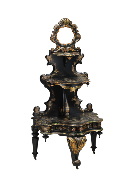 Этажерка, Великобритания, середина XIX века. Лёгкая многоярусная конструкция с изогнутым силуэтом и кабриольными ножками относится к стилю рококо ревивал. Чёрная окраска, роспись и инкрустация перламутром имитируют японский лак, популярный в оформлении английских буржуазных интерьеров. Это типичный «мебельный фон» для среднего класса: недорогой по материалу (частично папье-маше), но перегруженный декором и рассчитанный на демонстрацию коллекций безделушек.