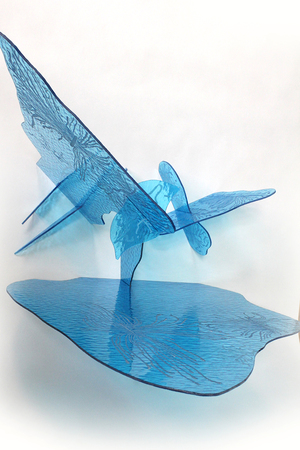 Работа с цветным стеклом, ручной гравировкой и УФ-склейкой выросла из размышлений о заблуждении инстинкта у насекомых в попытке колонизировать неподходящий материал. Через этот образ проект обращается к постгуманистической перспективе и напряжённым отношениям между природой и культурой.