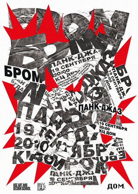 Плакат строится вокруг образа скомканности, который отражает суть группы БРОМ. Их музыка звучит энергично, рвано и неровно — противоречиво, но одновременно цельно и живо.