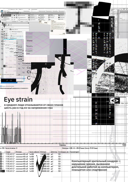 Плакат «Eye strain» — результат исследования компьютерного зрительного синдрома. На основе анализа данных о нарушениях аккомодации и контрастной чувствительности. Каждый графический элемент объясняется симптомами уставших глаз.