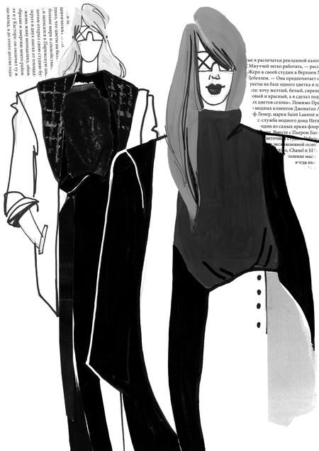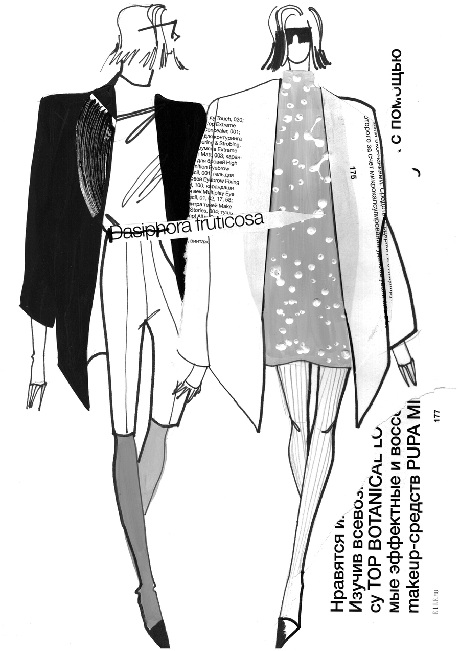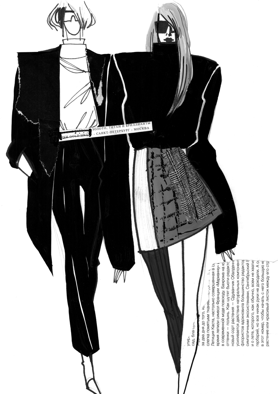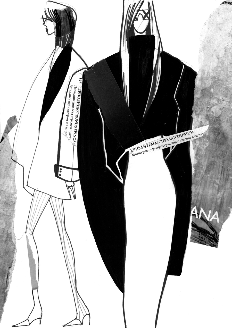 Классический силуэт символизирует вечные и неизменные человеческие потребности (безопасность, принадлежность к группе), в то время как нарочито увеличенный, «не по размеру» крой говорит о разрыве между человеком и его ролью в мире.