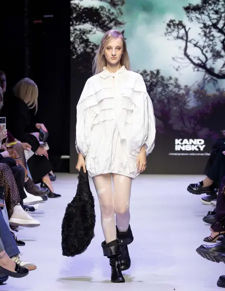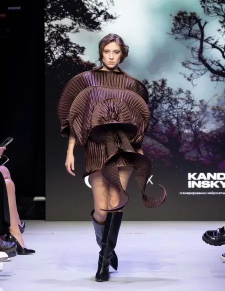 В показе были представлены модели с объемными силуэтами, визуально отсылающими к очертаниям деревьев. Ключевыми элементами дизайна выступили сложная драпировка, плиссировка, а также многослойные конструкции из органзы, декорированные рюшами. Цветовая палитра коллекции основана на природных оттенках, сочетающих глубокие тона черного и коричневого в контрасте со светло-бежевыми и молочно-белыми элементами [Источник].