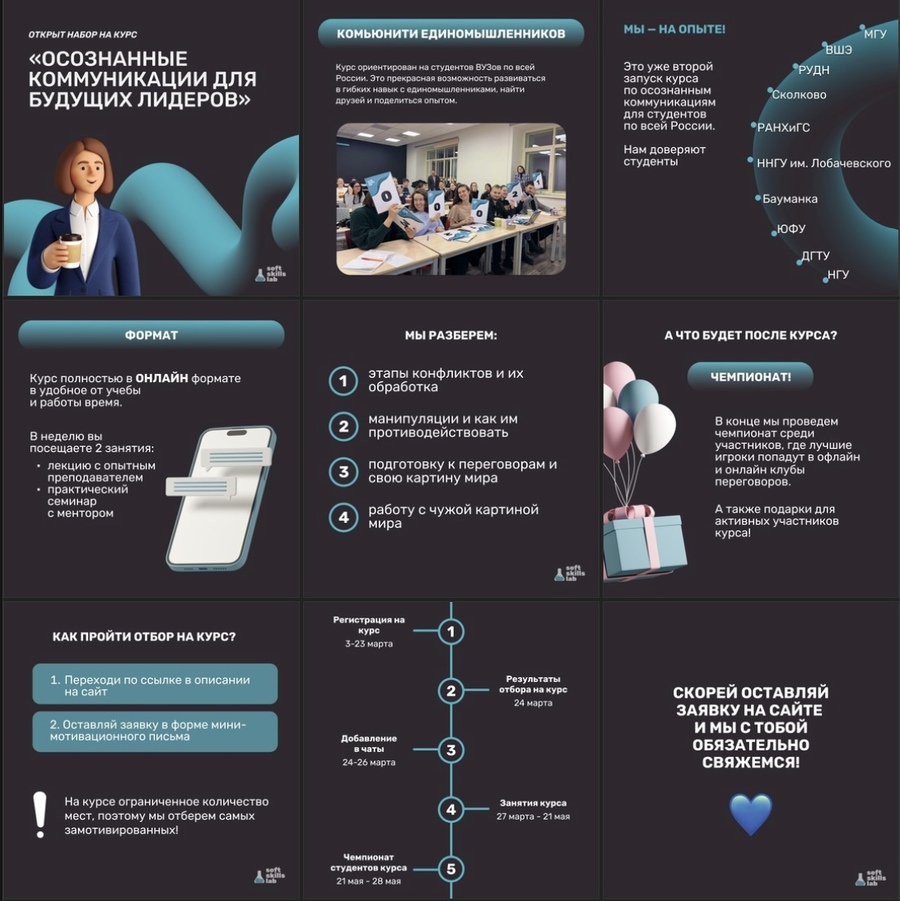 Клуб переговоров ВШЭ и Soft Skills lab — смежные организации, которые обучают ведению грамотной коммуникации и софтскиллам. Оба проекты продвигались через ВК, где размещались различные форматы: посты, баннеры, результаты участников и другое.