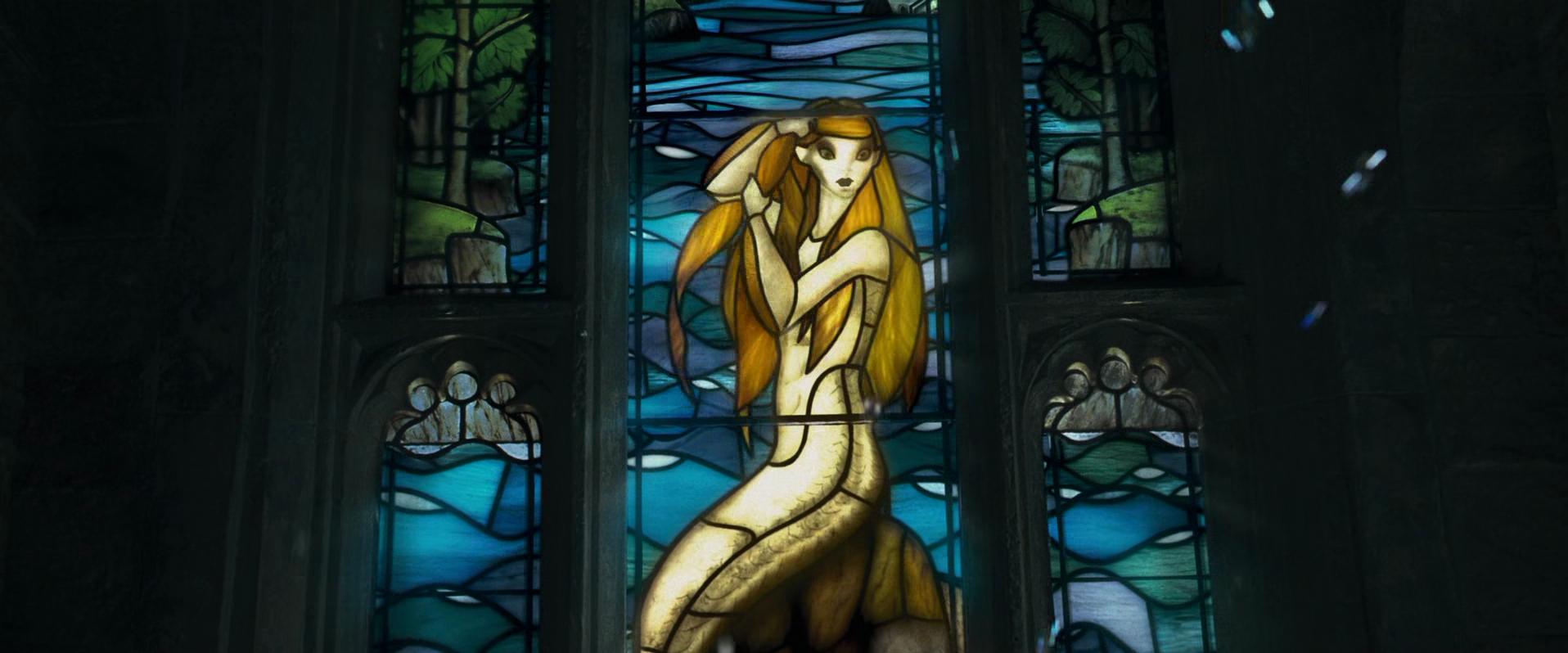 Поэтому и пространства Школы Волшебства украшены витражами. Чаще всего в них запечатлена символика Хогвартса, его факультетов или истории. Тем не менее, самым известным за всю киносагу является зачарованный витраж с русалкой из ванной комнаты старост, который появился в фильме «Гарри Поттер и Кубок огня» (2005). Этот витраж также называют «Портретом русалки», на нем изображена девушка с золотыми волосами и рыбьим хвостом, сидящая на скале. По сюжету она зачарована, как и все картины в мире магии: она двигается, смеется и видит все происходящее вокруг.