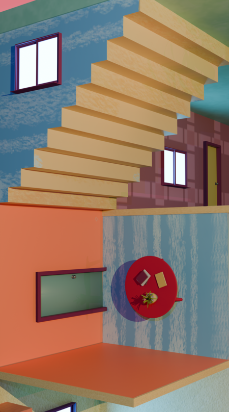 В ходе работы, я черпала вдохновение из лиминальных пространств, а также из литографии «Относительность» за авторством М. К. Эшера