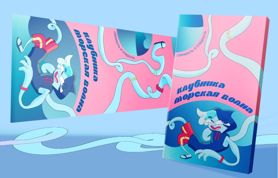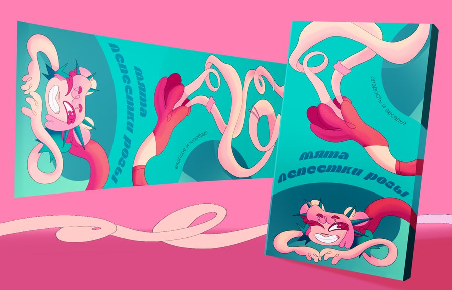 Ярко-розовый (#F37EB3) — сладость, детская энергия. Ярко-голубой (#0C9ED9) — свежесть, ассоциация с пузырями. Светло-розовый (#F2ACCE) — игривость. Жёлтый лимонный (#F2D028) — солнечность и радость.