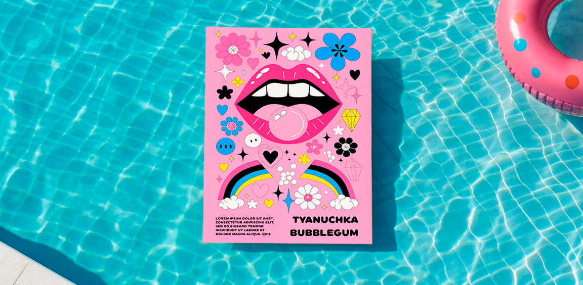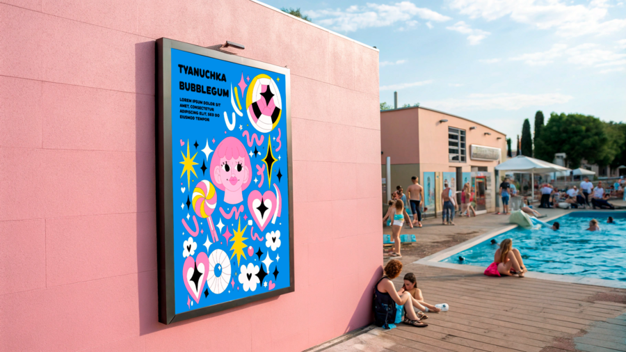 Модель: Recraft 20B style Photorealism. Промпты: 1.Vertical billboard on the pink wall. shot from front view. next to the billboard there is a woman in blue leaning on the wall and chewing gum. on the background of the picturethere is a pool party. daylight summer 2. White poster laying on the surface of the water in the pool. there are inflatable toys around it. daylight summer 3. Vertical white poster 16:10 on the pink wall on the beach. on the background there are two girls dancing daylight summer bright colors.