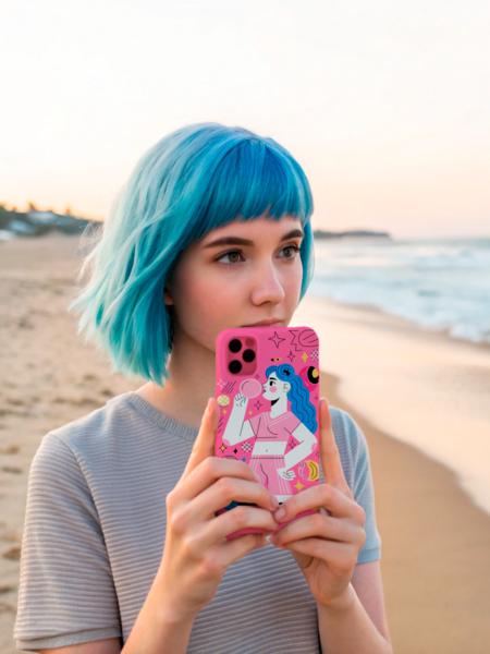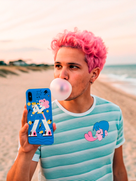 Мокап 2: Модель: Recraft 20B style Photorealism. Промпт: front view on white phonecase in hands of a guy with pink hair who is blowing a bubble with a gum. and beach on the back