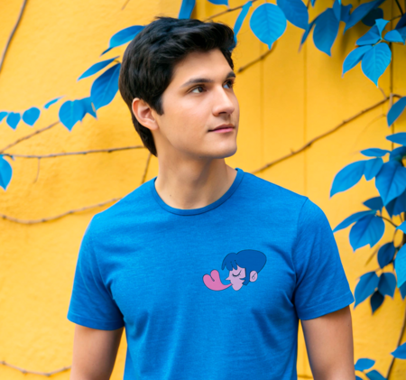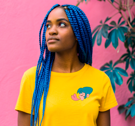 Модель: Recraft 20B style Photorealistic. Промпт: 1. front view of 20 year old woman with very short blue braids wearing yellow t-shirt on the back there are pink walls and blue tree leaves 2. front view of 20 year old guy with black hair wearing blue t-shirt on the back there yellow walls and blue leaves