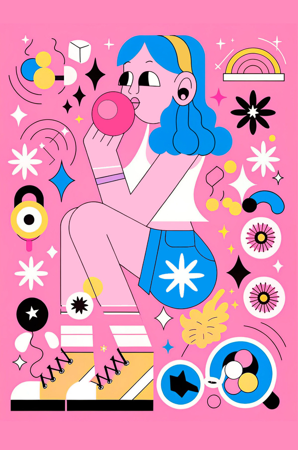 Модель: Recraft Vector Segmente colors Промпты: 1. Candy girl with lolipop and abstract elements including hearts and stars 2. Close up to lips where there is a bubblegum all over teeth. 3. Stretching bubble gum candy with abstract elements around
