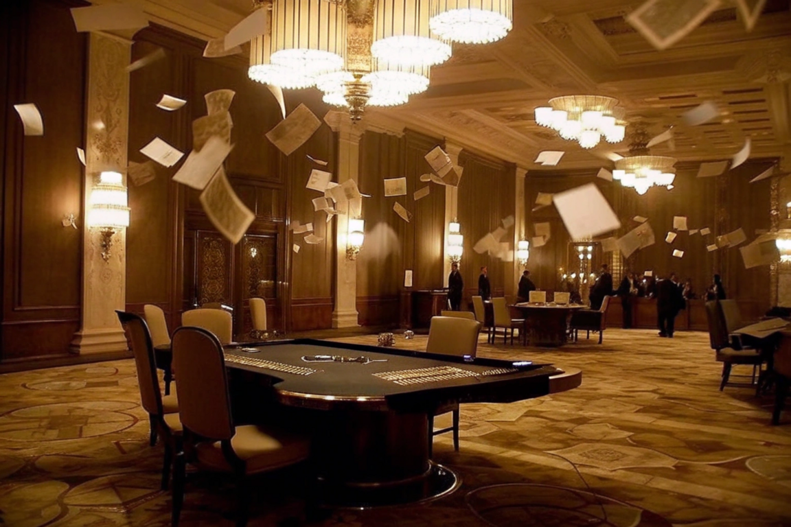 A luxurious casino with warm light from chandeliers illuminating the black marble floor. A black roulette table stands in the center, surrounded by a gambling crowd, with bright slot machines and tall chip towers throughout the room.