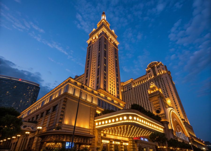 The luminecent casino building stands tall and illuminated against the backdrop of a deep blue sky, its unique architecture characterized by a towering structure. The building is adorned with a multitude of lights, casting a warm glow that accentuates its intricate design. The perspective of the photo is from a low angle, looking up towards the sky, which further emphasizes the building’s impressive height and grandeur.