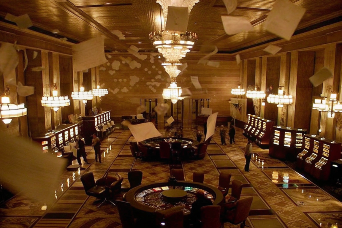 A man in noir setting wearing a white shirt and a tie. The camera is a close up to the tip of the tie, it takes up 80% of the photo. The background is a casino, with golden colors. Overall photo has a yellow tint
