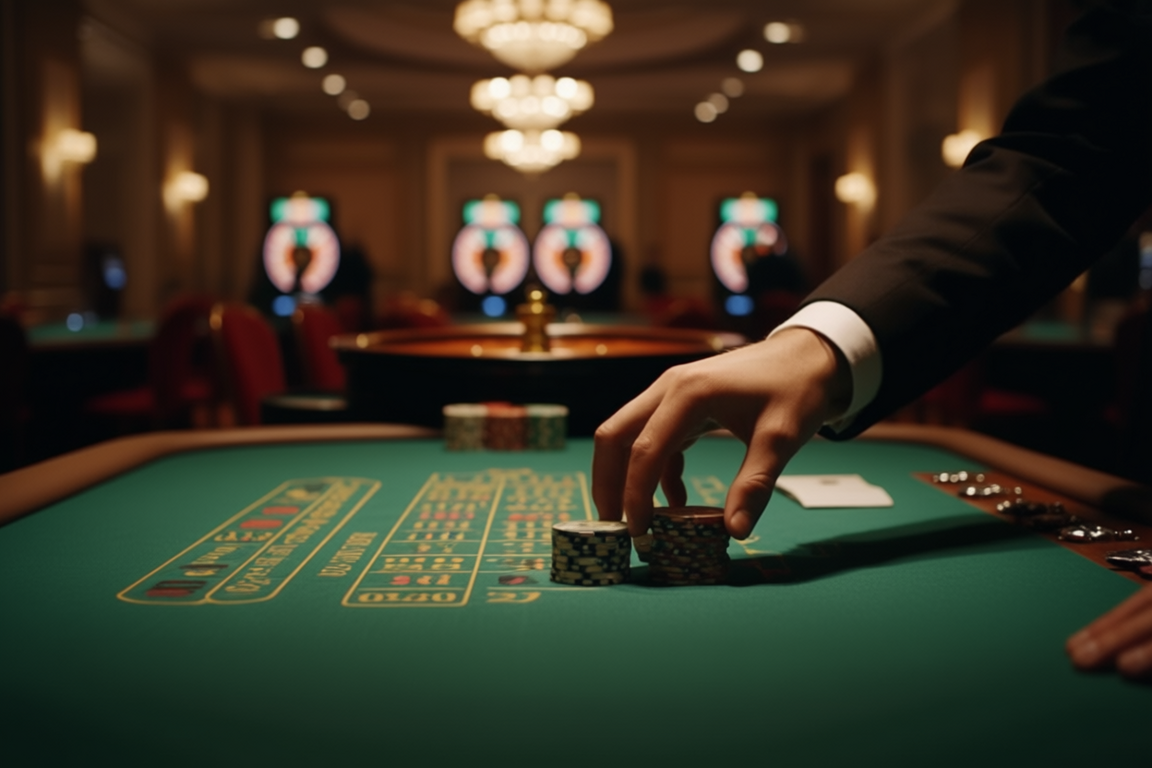 The image shows a close up of a roulette table with chips and a few office papers scattered on it in the background. There are hands holding playing cards taking up a third of the image.