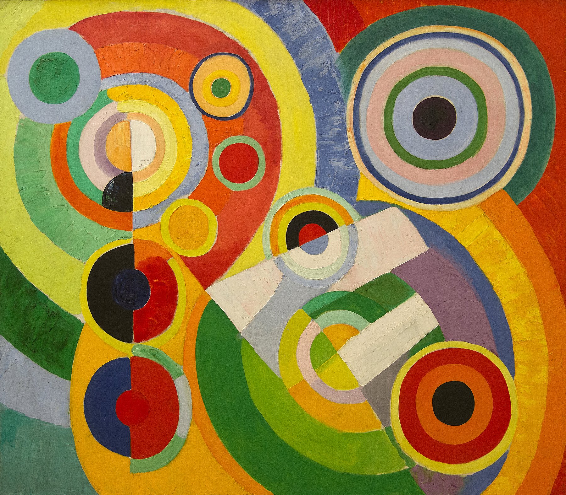 Картина «Ритм, радость жизни», созданная в 1930 году французским художником Робером Делоне, является ярким примером орфизма — направления авангардного искусства начала XX века. В её композиции преобладают геометрические формы: яркие круги, дуги, кольца и арки различных диаметров, а также изогнутые полукруглые полосы. Эти элементы образуют калейдоскоп переплетающихся и взаимопроникающих форм, создавая ощущение движения, вращения и динамики. Главной целью художника было сосредоточить внимание зрителя на соотношении разноокрашенных фигур, что позволило ему создать идеальную сбалансированную композицию.