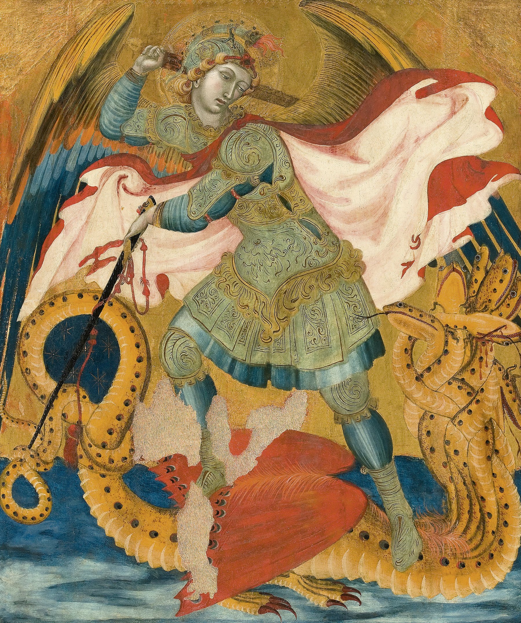 Полиптих «Святой Архангел Михаил, поражающий дракона между святыми Варфоломеем и Бенедиктом…» из аббатства Рофено был создан одним из самых выдающихся художников XIV века — Амброджо Лоренцетти — приблизительно в 1330–1335 годах. Вдохновленная сюжетом Откровения Иоанна Богослова, центральная панель полиптиха изображает Архангела Михаила, одерживающего победу в битве между Адом и Раем — в ожесточенной борьбе он поражает и уничтожает дракона, выступающего аллегорическим олицетворением зла и дьявольских искушений.