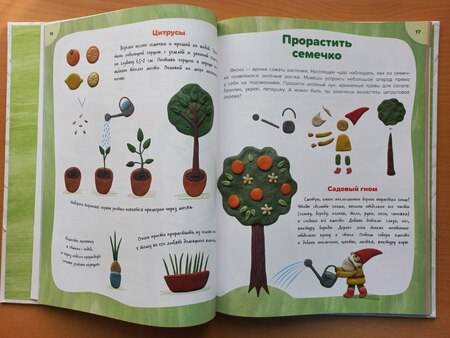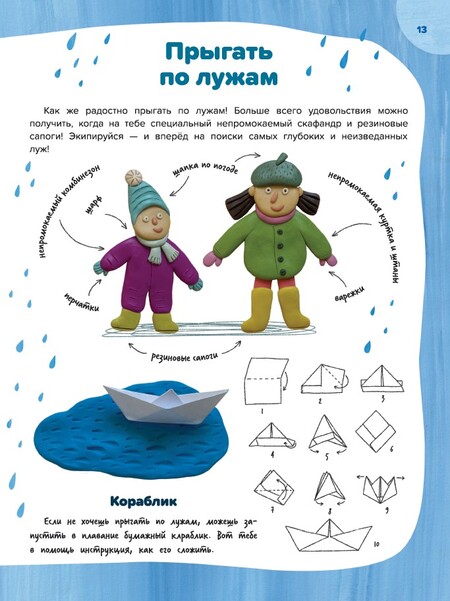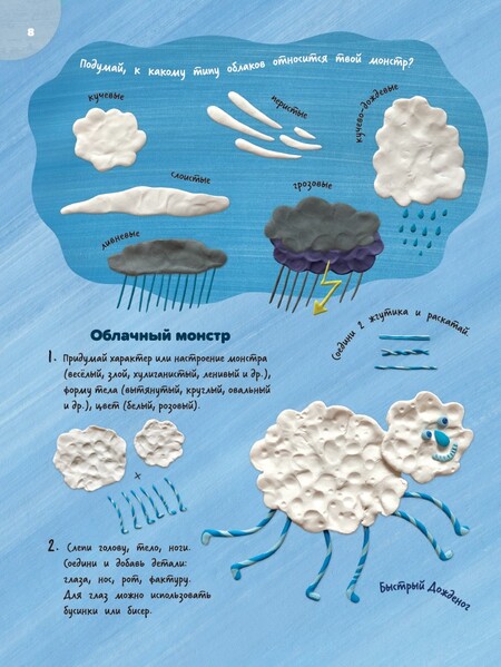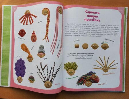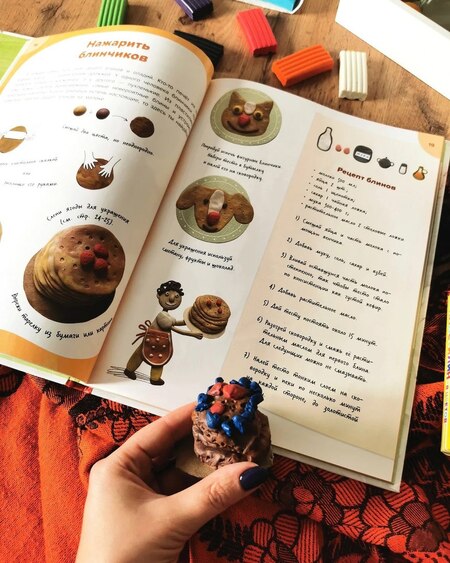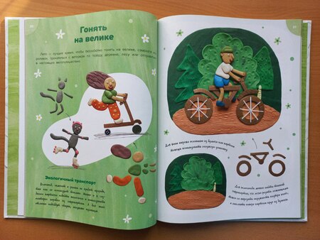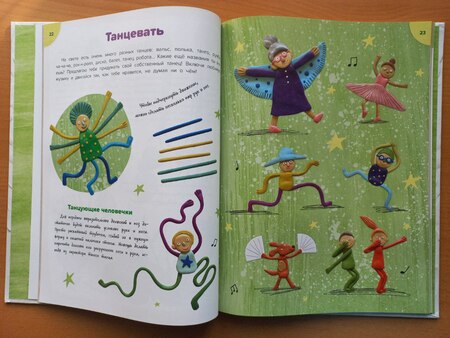 Книга разделена на главы, по 1 главе на каждый разворот. На каждом развороте своя тема для лепки. Изображены как отдельные персонажи с пошаговыми инструкциями, как их слепить, так и сюжетные композиции.