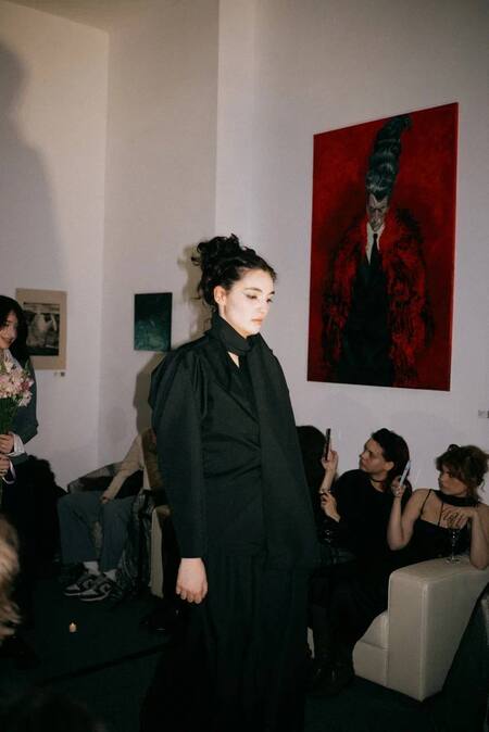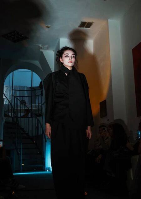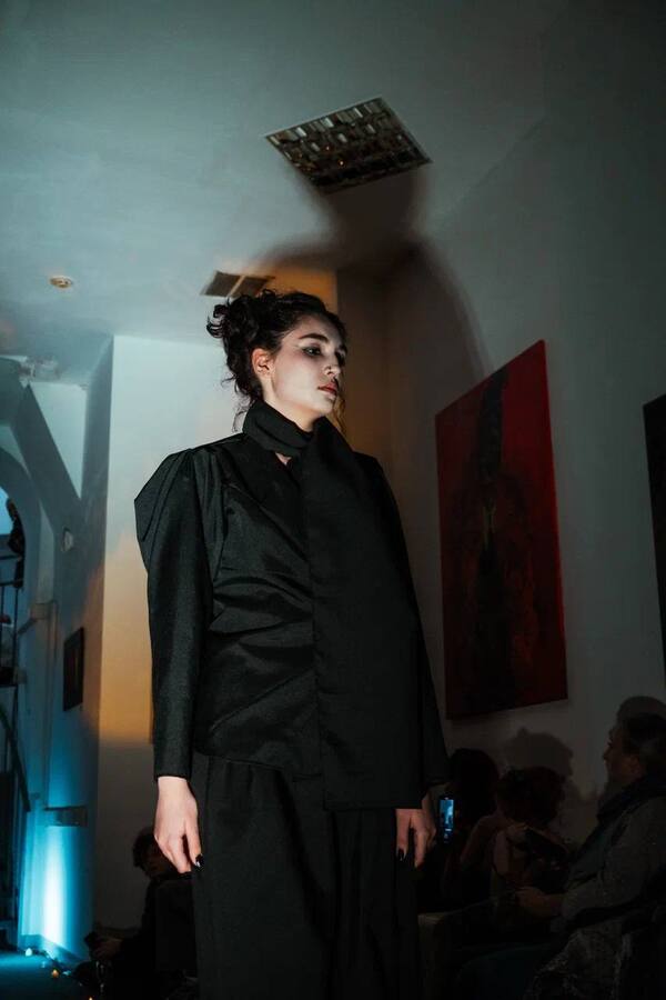 4. Работа на показе • Подбирала стилистику показа: обувь, прическу и минимальный макияж, усиливающий ощущение внутреннего напряжения. • Контролировала посадку костюма, финальную корректировку узлов и фиксаций. • Участвовала в обсуждении порядка выхода модели, чтобы образ читался в нужном эмоциональном ритме показа.