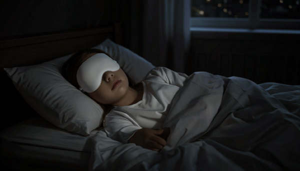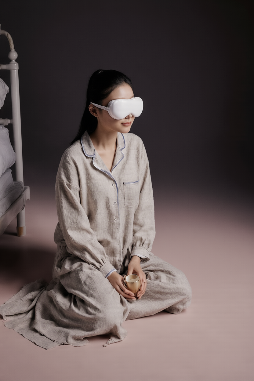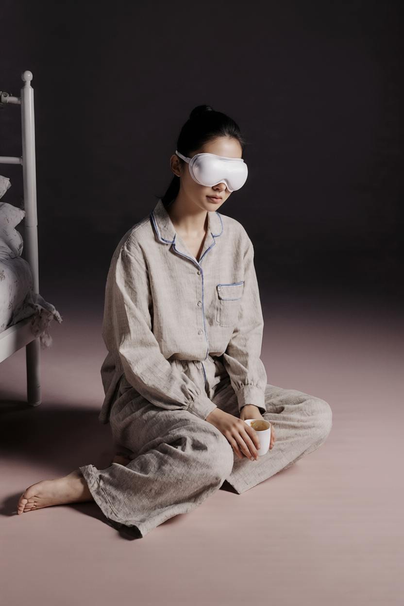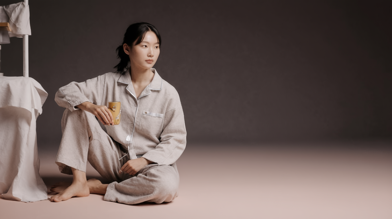 Сгенерировано в Krea: A woman in cozy beige linen pajamas sits cross-legged on a pink floor, wearing a white sleep mask. She holds a white mug, gazing thoughtfully. Soft studio lighting.