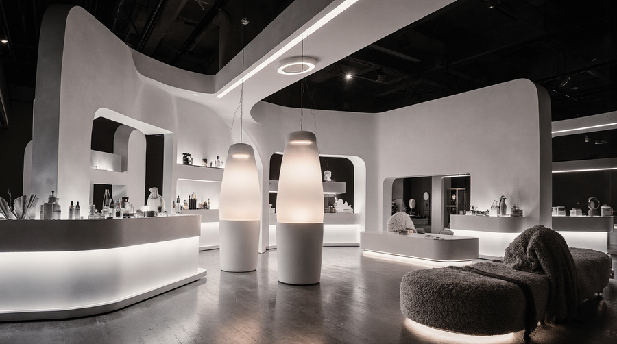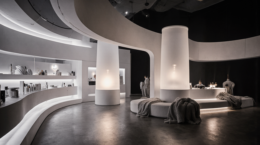 2. Подробный промт для генерации пространства: A stunning, monochromatic interior of a high-end boutique or concept store, rendered in a sophisticated black-and-white aesthetic. The space features sweeping, organic curves and sculptural architecture with smooth, white concrete-like surfaces. Large, cylindrical pillars dominate the scene, each embedded with vertical strips of warm, glowing LED light that cast a soft illumination. A central, low-profile circular platform with integrated under-lighting holds two minimalist mannequins — one draped in flowing fabric, the other bare — positioned as if on display. A plush, textured throw blanket is casually draped over the platform’s edge, adding tactile contrast.
