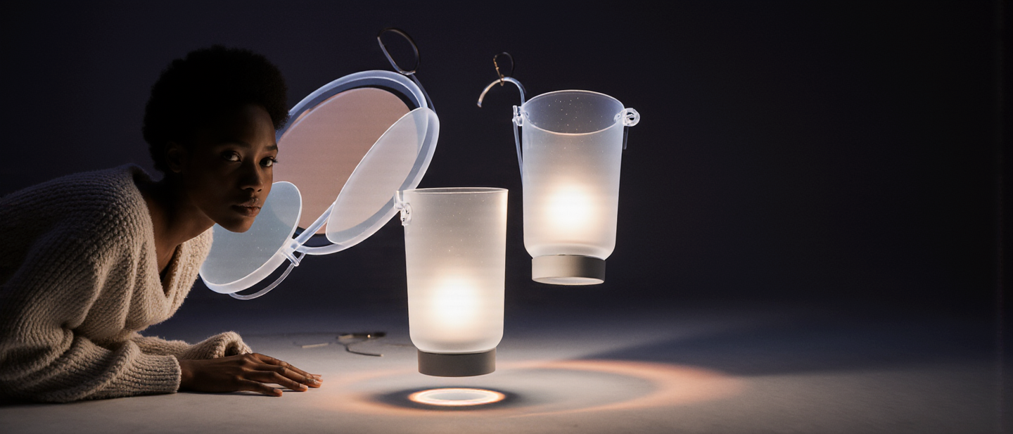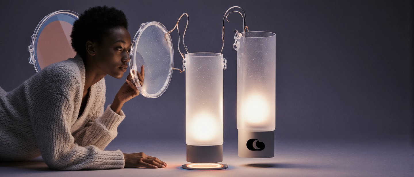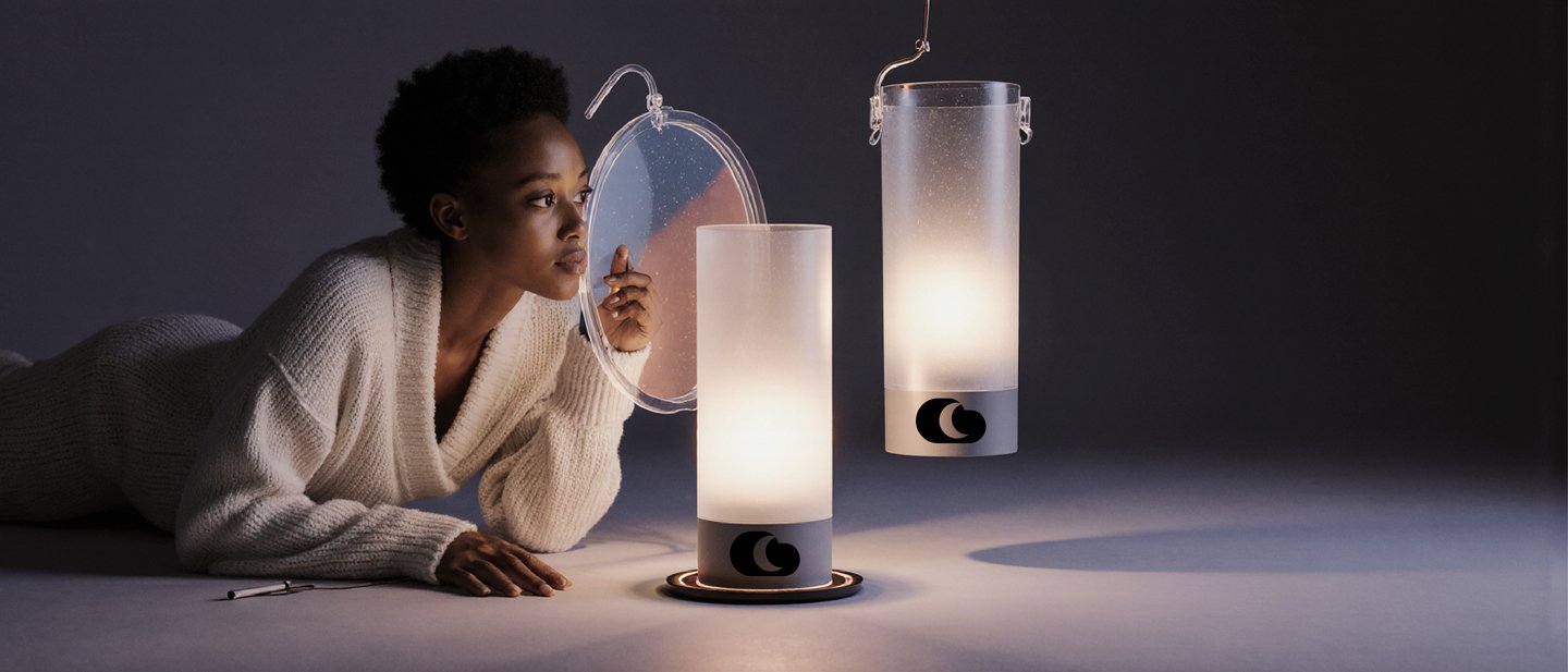 1. Промт для генерации рекламных баннеров и обложки проекта (Qwen, ChatGPT) + Krea и картинки-референсы: A woman with short, dark curly hair and dark skin lies on her stomach on a soft, light-colored surface, wearing a cozy, oversized beige knit sweater. She gazes intently at two modern, cylindrical lamps standing before her. The lamps have frosted glass bodies filled with tiny, sparkling particles, giving them the appearance of captured starlight or snow. Each lamp has a sleek, matte grey base; the one on the left sits on a circular platform that glows with a warm orange ring, while the one on the right stands directly on the surface. Both lamps emit a soft, warm white light from within. The woman holds a transparent, circular disc with a thin metallic frame close to her face, as if examining it or using it as a lens. Behind her, another similar disc leans against the wall, its surface reflecting a subtle blue and pink gradient. The scene is set against a deep, muted purple-grey backdrop, creating a calm, contemplative, and slightly surreal atmosphere. The lighting is soft and directional, highlighting the textures of the sweater and the gentle glow of the lamps.