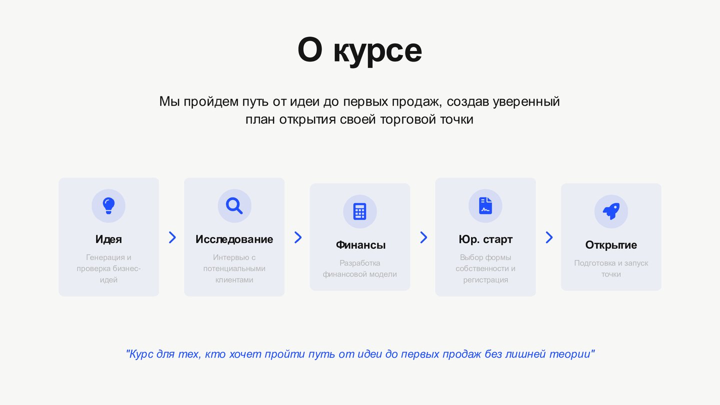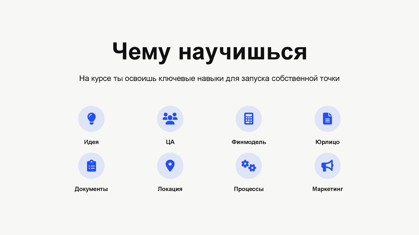 Это практический курс о запуске своей первой точки общепита/ритейла. Ты пройдёшь короткий, но полный путь предпринимателя: от идеи — до первых продаж.