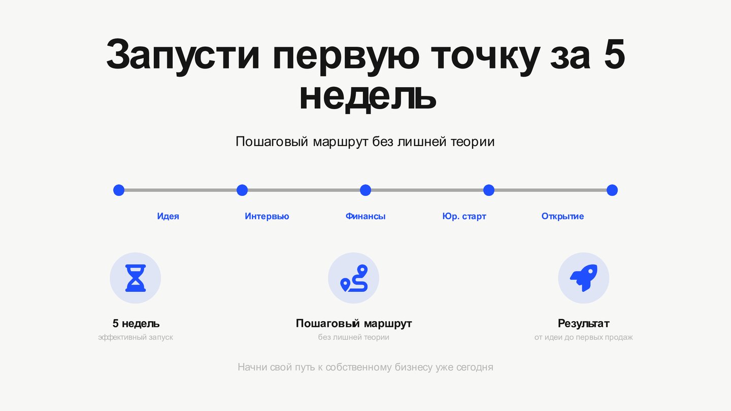 За 5 недель ты соберёшь проект точки по шагам: ❶ проверишь, что идею реально купят ❷ посчитаешь экономику ❸ подготовишь юридическую базу и сделаешь план открытия К финалу у тебя будет не «презентация мечты», а готовый пакет запуска: идея + спрос + финмодель + документы + сценарий старта.