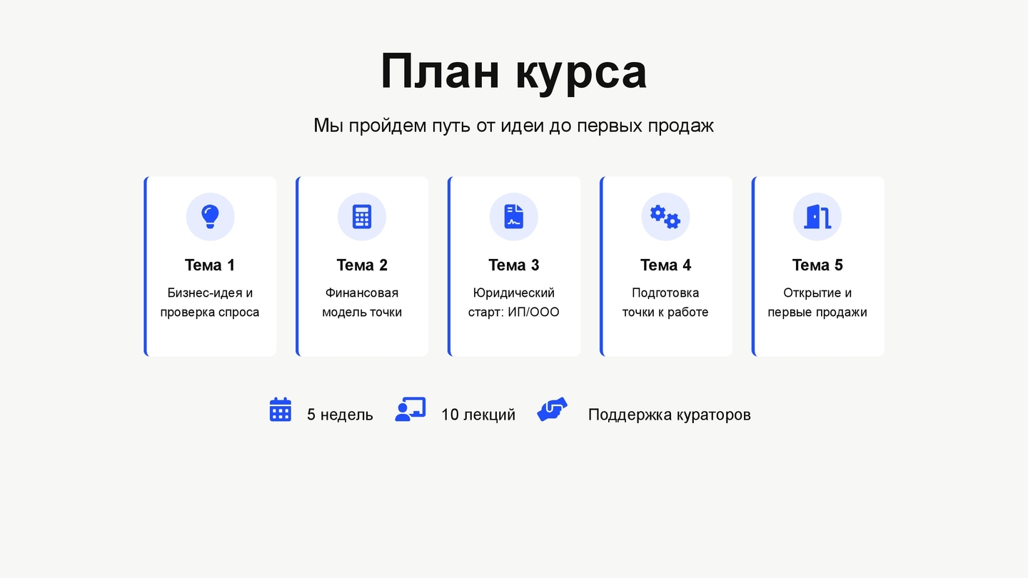 Курс идёт 5 недель — каждая неделя закрывает одну большую задачу предпринимателя