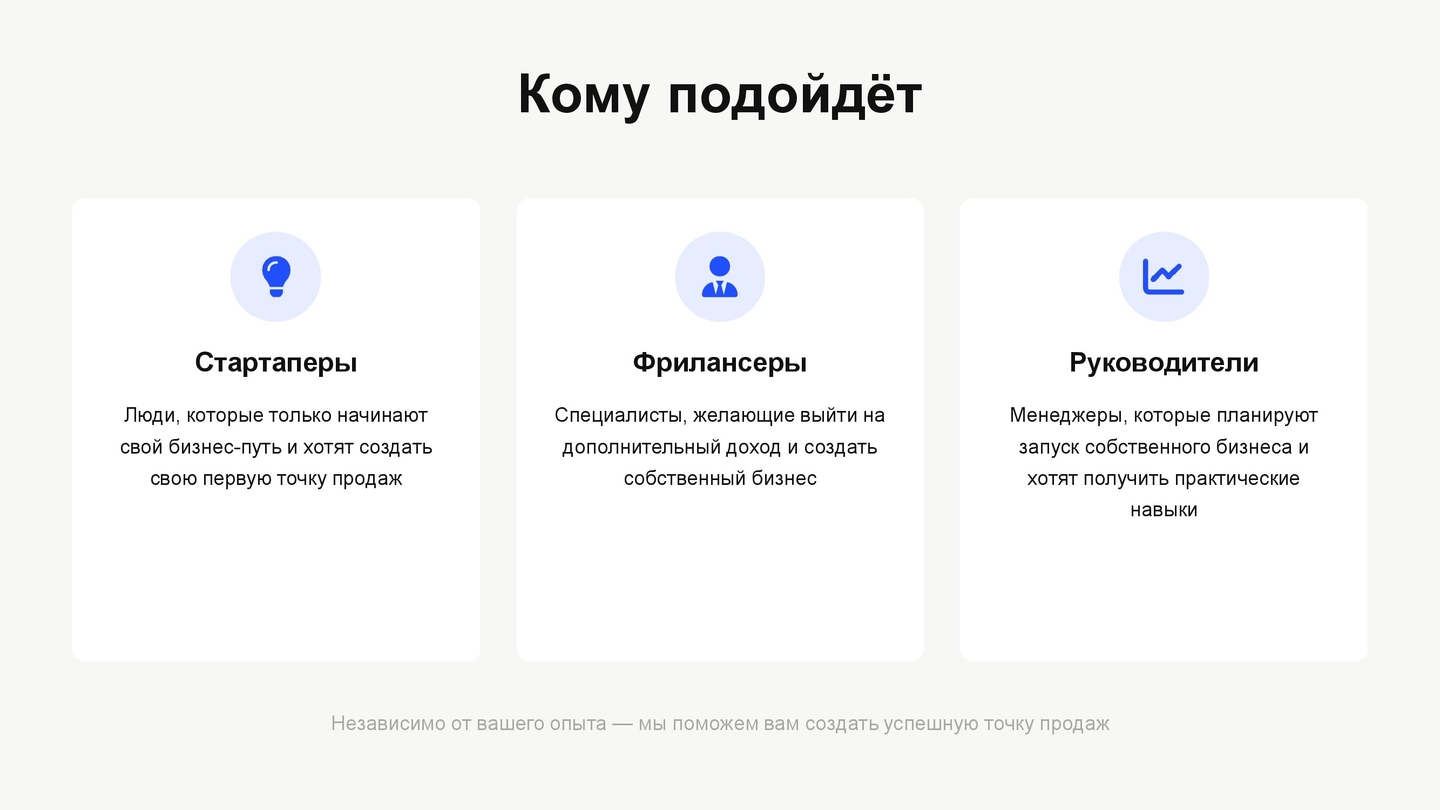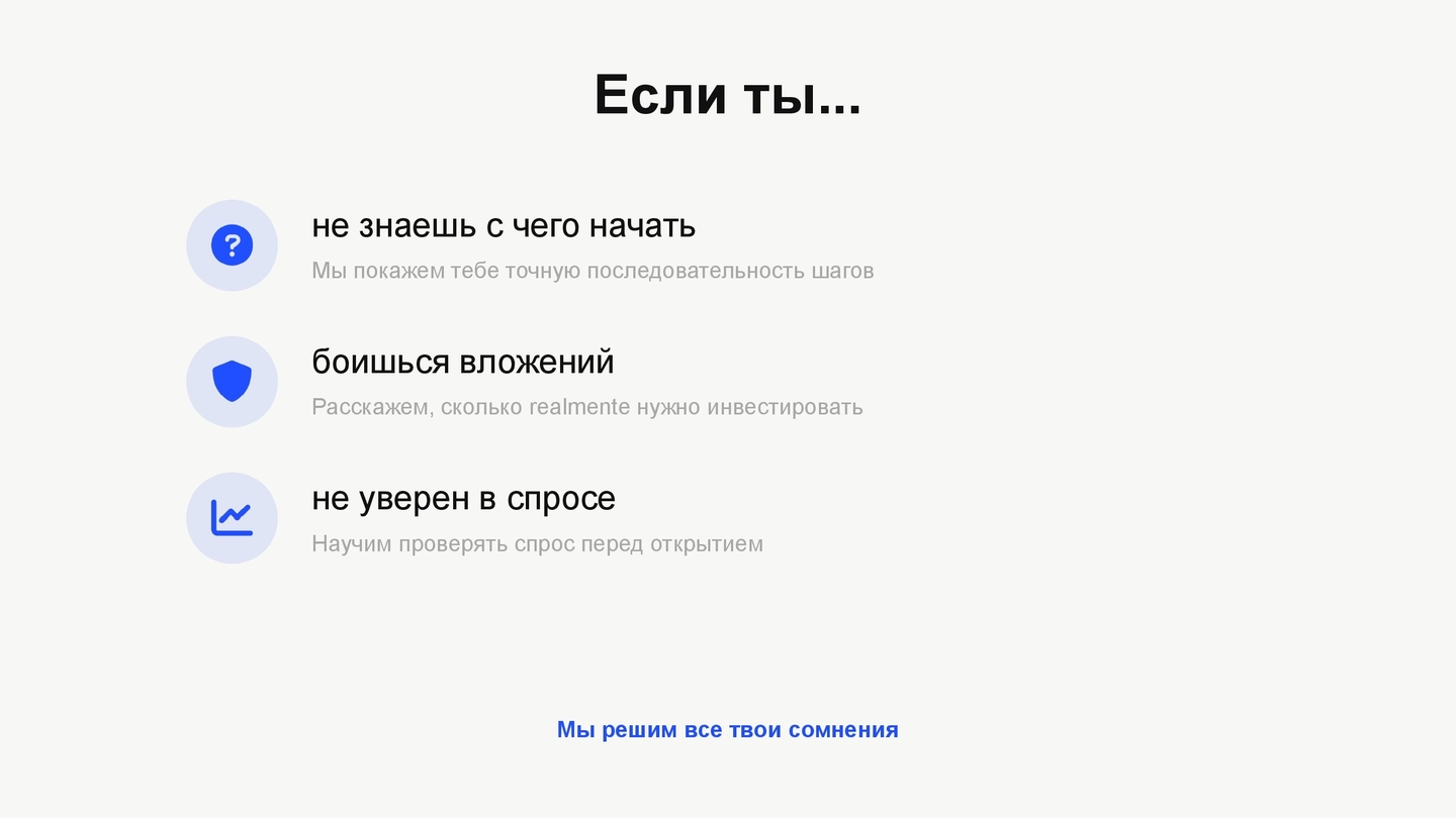 • давно думаешь о своей точке, но не понимаешь, с чего стартовать • боишься вложить деньги в то, что не взлетит • не уверен, что на твой продукт есть спрос • хочешь реальный план действий, а не общие советы