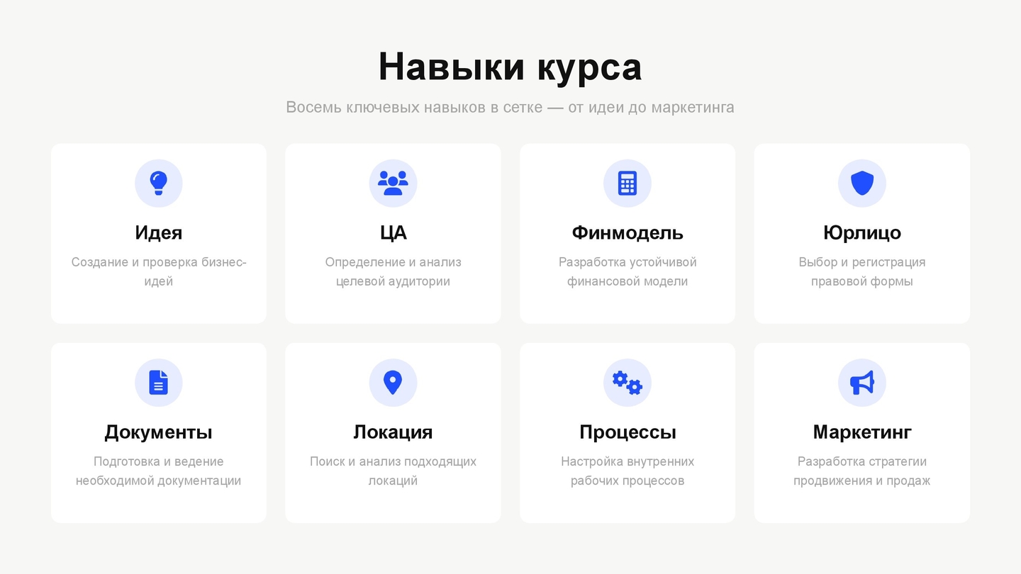 Курс даёт 8 ключевых компетенций для владельца точки. Они не «про теорию», а про твою реальную сборку