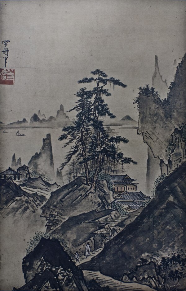 Сэссю Тойо, «Пейзаж», находится в частной коллекции семьи Охара, 15-16 век [4]. Справа представлен фрагмент для более точного рассмотрения работы художника